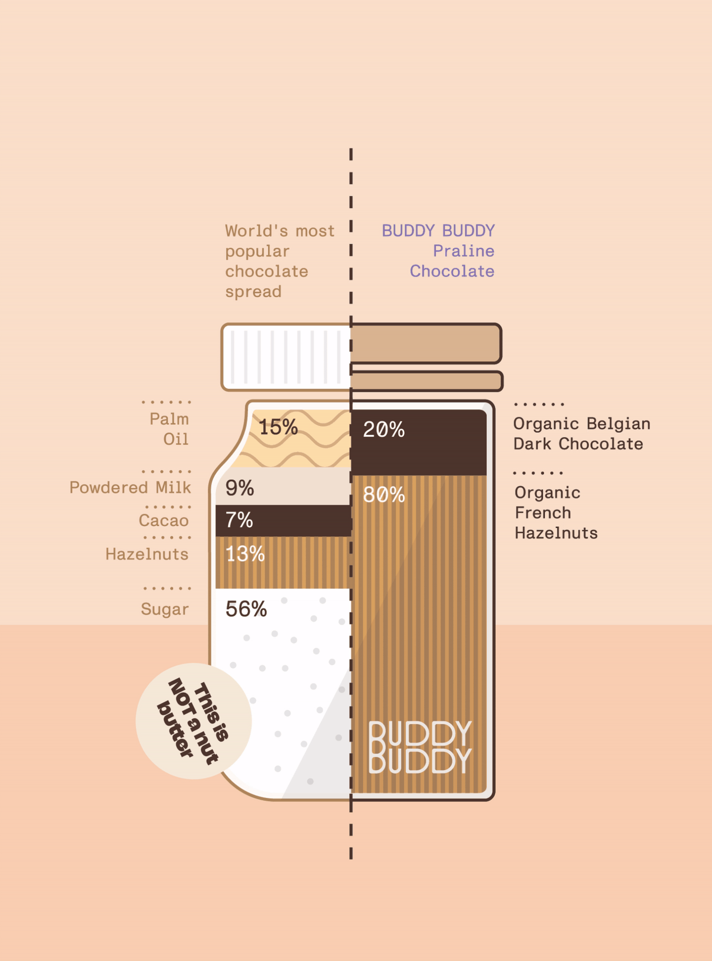 Praline Chocolate, our hazelnut chocolate nut butter, comprises of just two organic ingredients–80% hazelnuts and 20% dark chocolate. That’s 6x more hazelnuts and 4x less sugar than Nutella.